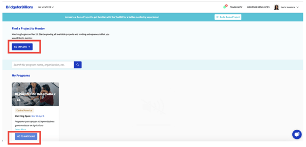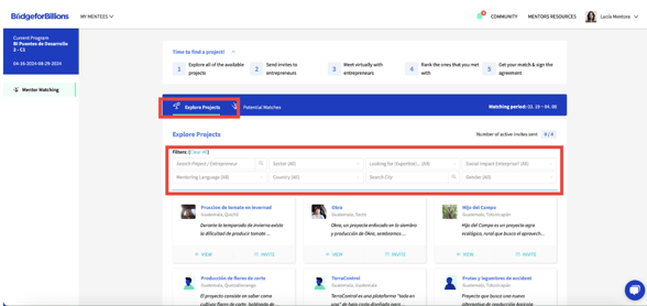- In the "Explore projects" section, you can find all projects and entrepreneurs. Use any of the filters if you want to conduct a more specific search.