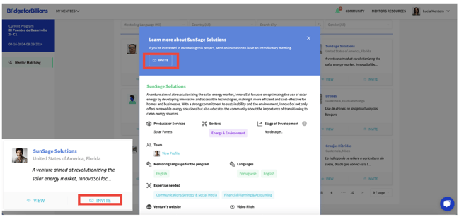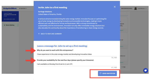 - After clicking on "Invite," you must indicate why you would like to collaborate with that entrepreneur and write your availability for the next 4 days, specifying your time zone, and click on “Send Invitation.”