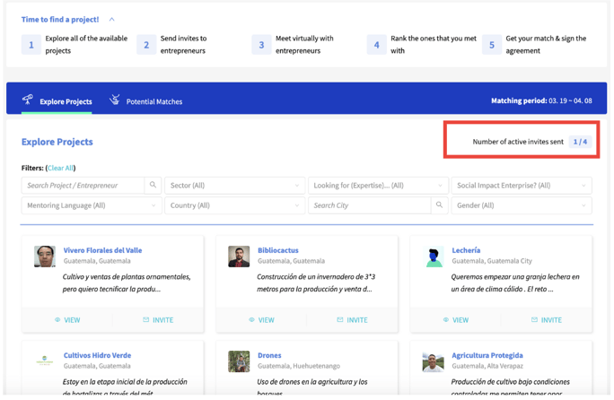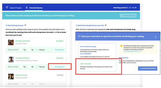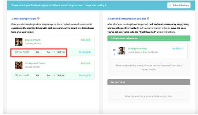 - After sending the invitations, you can go to the "Potential Matches" section and mark if you have met or not with the entrepreneur.