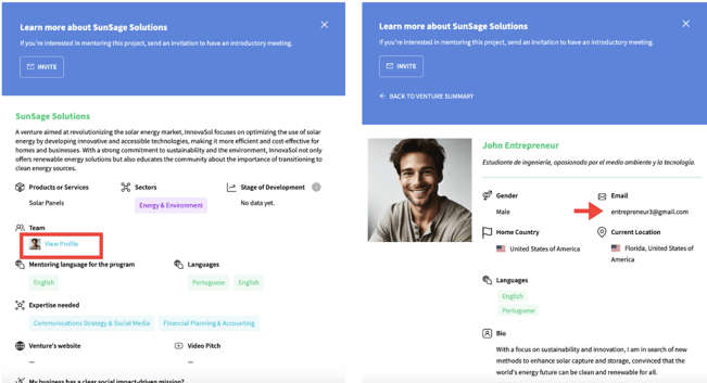 - You can find the entrepreneur's email address on their profile, allowing you to communicate when necessary.