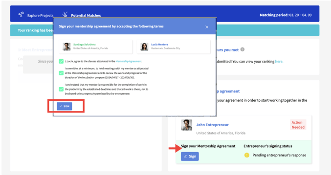 - After the entrepreneur has accepted, you will need to sign the mentoring agreement and mark the three corresponding checkboxes. Once you have read the agreement, click on "Sign" and begin your journey as a mentor.