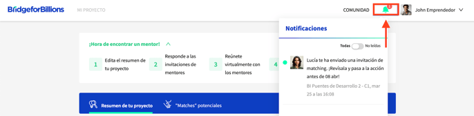 Mantente atento a las notificaciones que aparecerán en la campanita en la esquina superior derecha para revisar las invitaciones de los mentores.